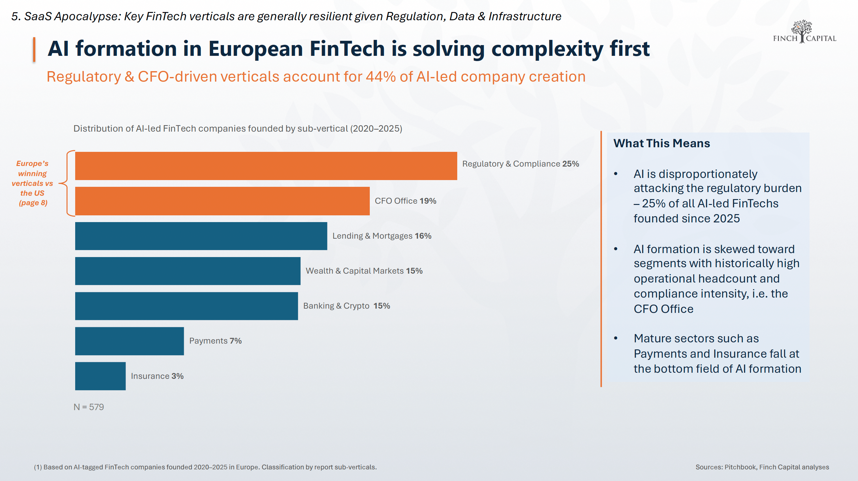 Répartition des nouvelles fintechs IA européennes par vertical : conformité, outils de pilotage financier, lending, wealth, banking & crypto, payments. (Finch Capital)