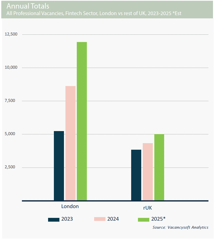 Évolution des postes fintech à Londres vs le reste du UK. (Morgan McKinley)