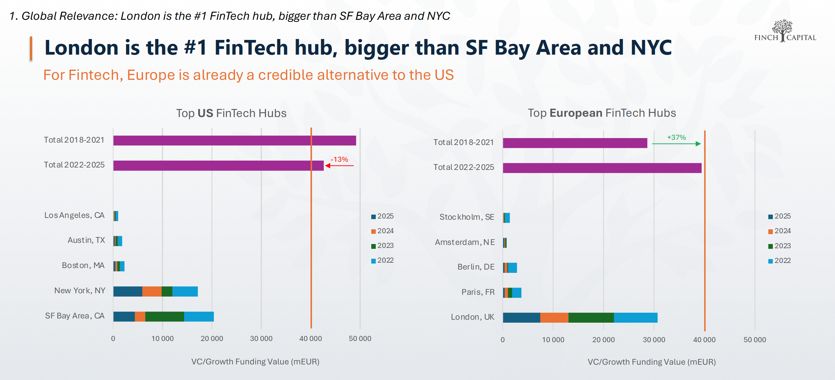 Comparatif des principaux hubs fintech mondiaux : Londres vs SF Bay Area, New York et grands hubs européens.